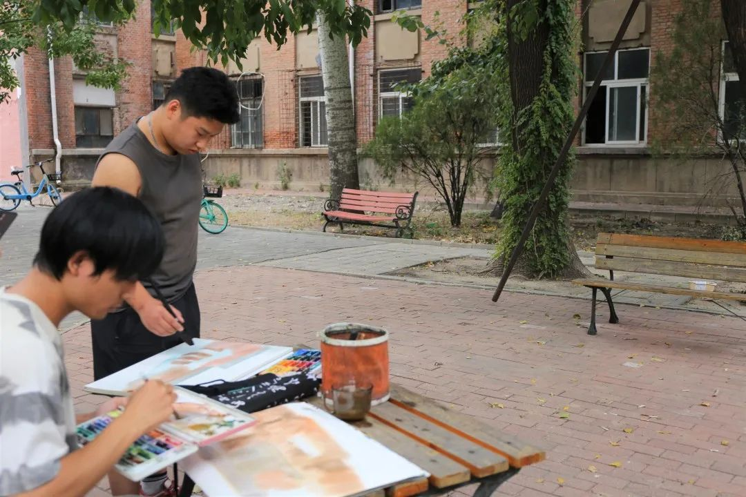 视觉2002班陈导航、袁少帅两名同学,也带来了自己的画具。同样以第一教学楼为取景地,选取不同的视角,在旁边进行创作。