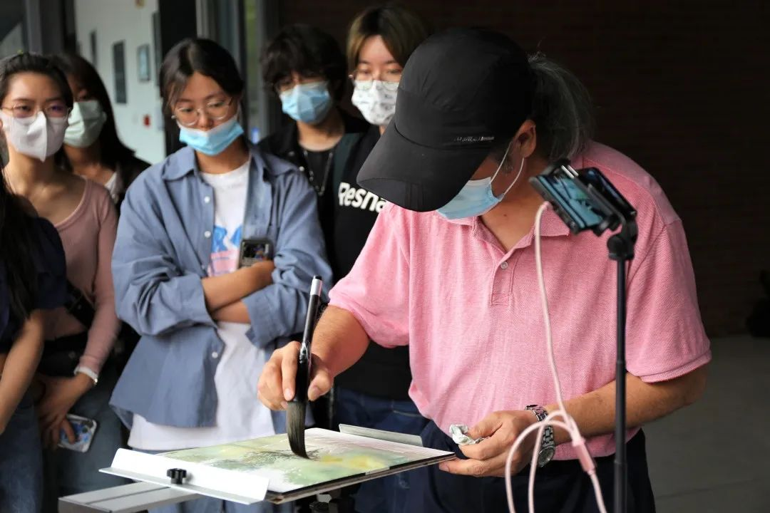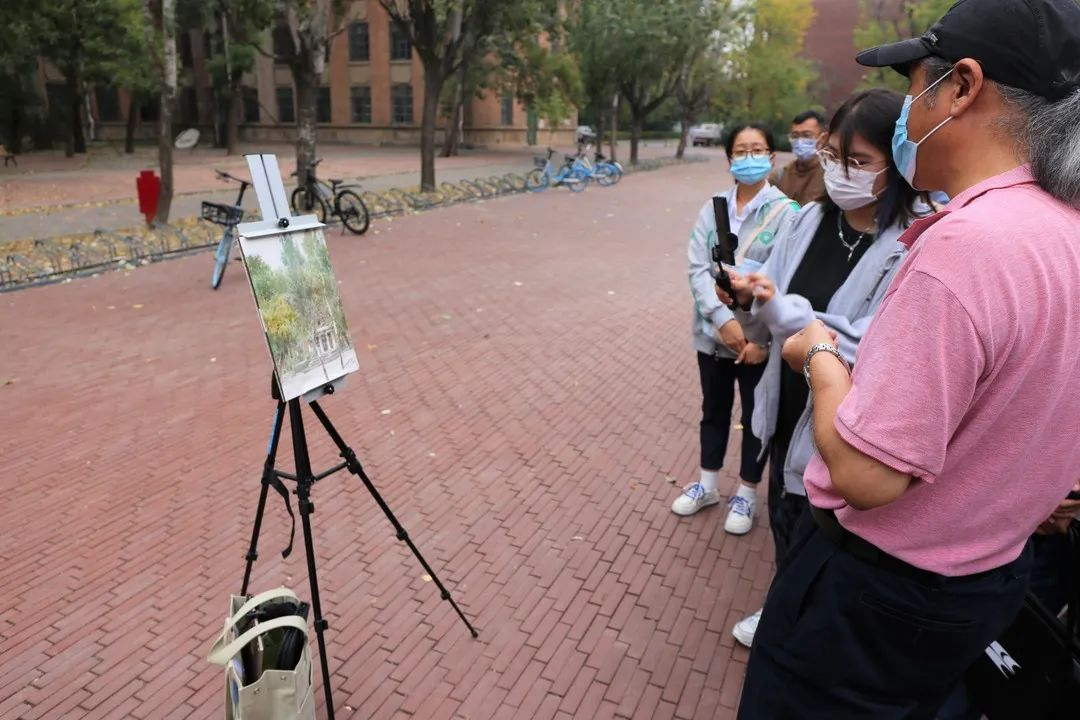 创作完成后,王院长为同学们细致地讲解了实景写生的要点,从构图、主次、细节等方面进行多角度的分析。王院长分享自己在创作过程中的心得和体会,提到“画写生并不是像摄影那样对景色进行一个复制粘贴,他一定是经过你自己的思考和主观处理的,每个人都会有不同的想法,就像是个人画这幅画就会有十种不同的表达方式,美并不是千篇一律的。”鼓励同学们在平时多动笔,让艺术融于我们的生活,在生活中获取创作和设计的灵感。