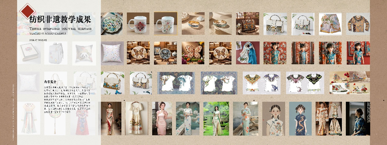 该课程立足我国丰富的纺织非遗资源,构建了“认知-实践-传承-创新”课程体系和面向社会的非遗文化大思政实践体系。课程打破传统课堂边界,通过传承人讲座、手操实践、创智沙龙、走进中小学、非遗汇展等多种形式,为传统技艺的当代转化探索一条“青春路径”,并积极引导学生将非遗的图案、工艺、美学精髓与现代设计语言相结合,进行创新性设计实践。